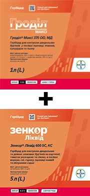 Комбінація Гроділ® Максі та Зенкор® Ліквід має подвійну дію на бур’яни: через листя й через ґрунт. За використання комбінації препаратів, яка діє проти вегетуючих бур’янів, а також потрапляє на поверхню ґрунту, діючі речовини